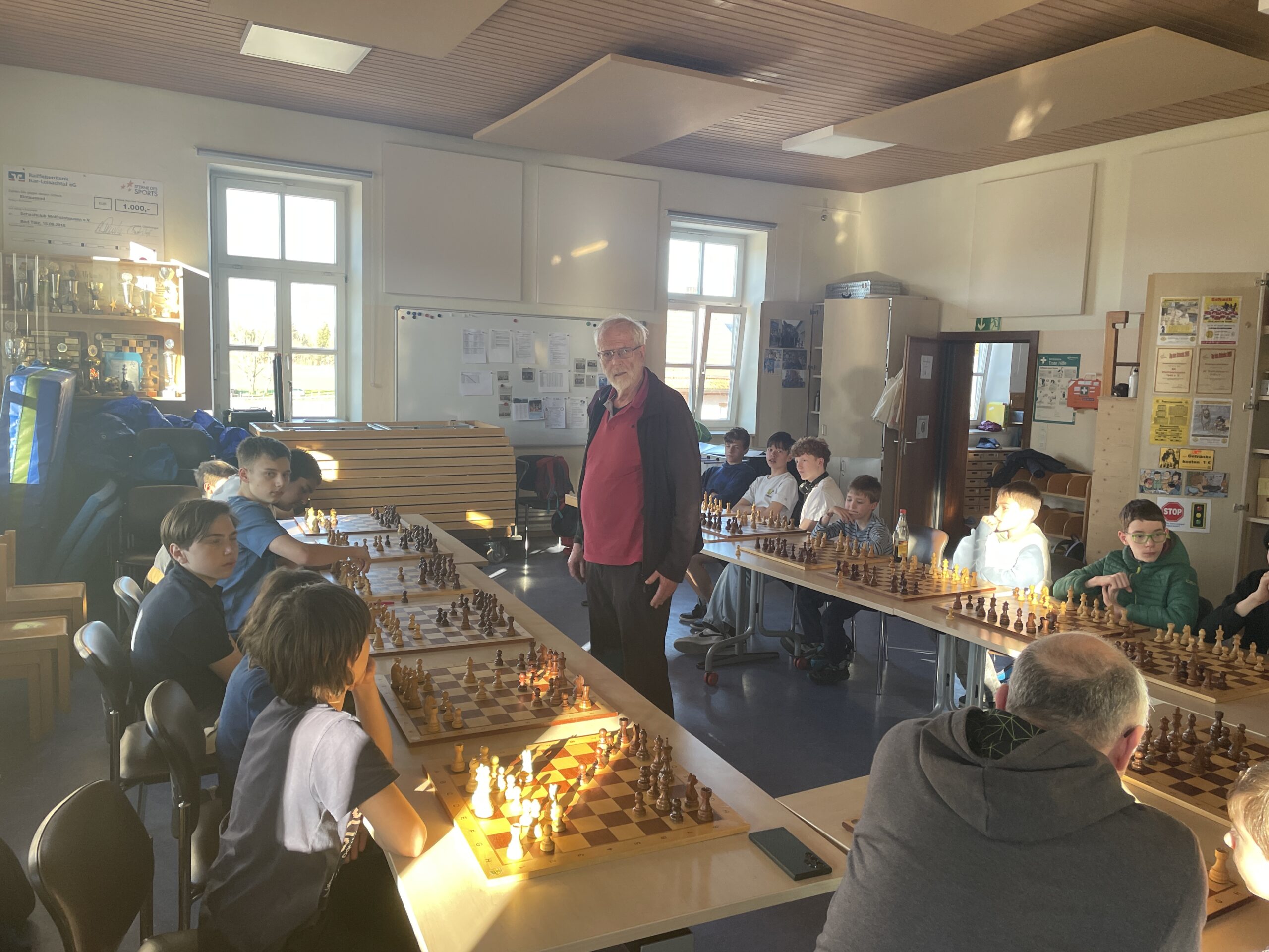 Heute stand etwas besonderes auf dem Programm für das Jugendschach: Einer unser stärksten und erfahrensten, Reinhold Pohle, stellte sich an 15 Simultanbrettern unserem Nachwuchs! Die Kids hatten allesamt die weißen Figuren und konnten so z.B. etwas über die Skandinavische Verteidigung lernen.
