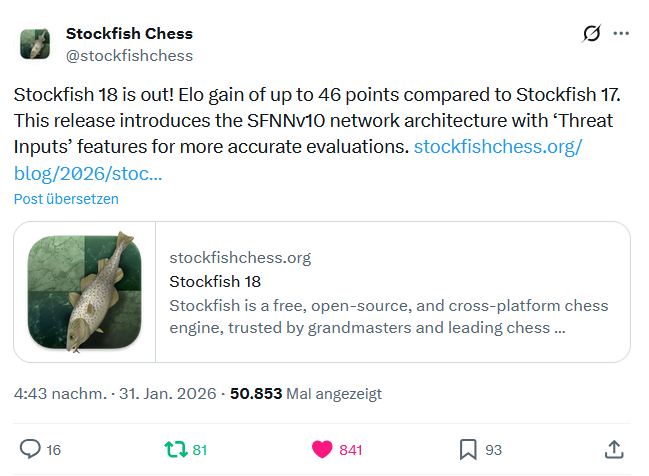 Für alle Schachfreunde, die ihre gespielten Turnierpartien regelmäßig mit Computerhilfe analysieren, oder auch einfach nur den Computer zum Trainieren verwenden, gibt es eine interessante und gute Neuigkeit: am letzten Samstag wurde die weltweit stärkste Schach-Engine Stockfish vom Entwicklerteam in der neuen Hauptversion 18 freigegeben, wie das Team auf X ankündigte.