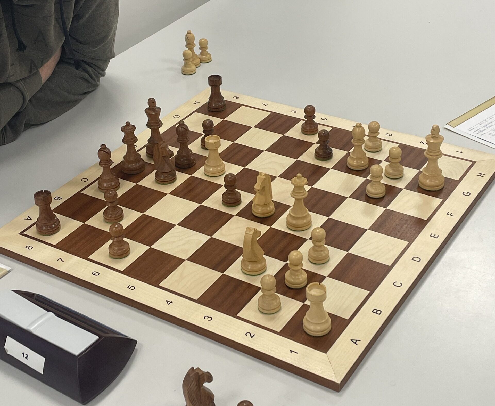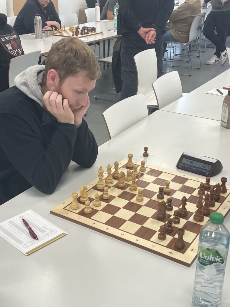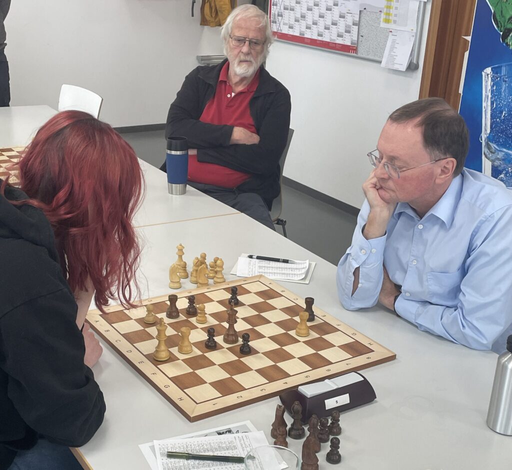 Kurz darauf aber das Drama an Brett 8: David Prassas, ansonsten ein Punktegarant in dieser Saison, erwischte heute einen schwarzen Tag. Bereits „hoffnungslos auf Gewinn stehend“, verpasste er eine klare Entscheidungsmöglichkeit und geriet, trotz gewonnener Qualiät, in Probleme. Damit nicht genug, denn plötzlich reklamierte der Gegner Zeitüberschreitung! Sehr ärgerlich, vor allem für David, und 2,5 : 2,5 somit der Zwischenstand …