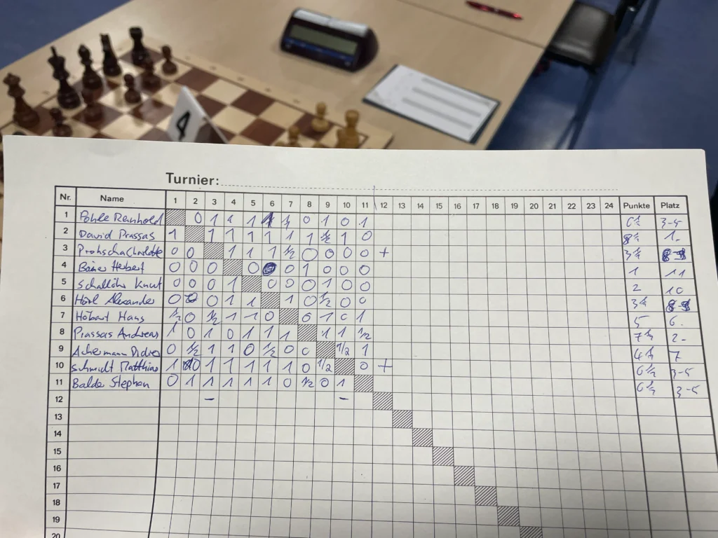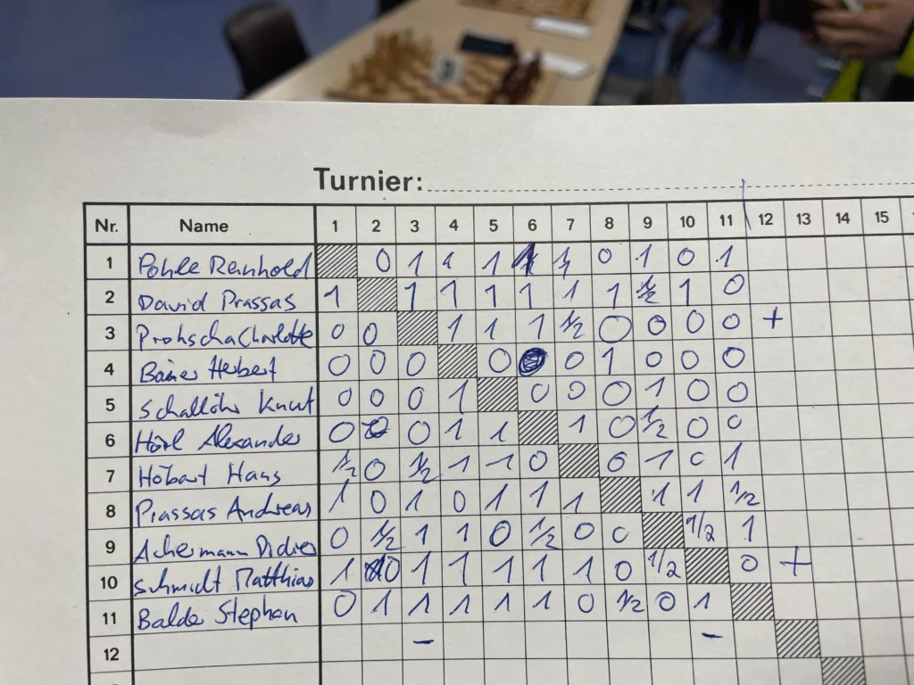Mit 8,5 Punkten aus 10 Runden gewann David vor seinem Vater Andreas (7,5). Matthias Schmidt, Reinhold Pohle und Stephan Balder belegten mit je 6,5 Punkten die Plätze 3-5 vor sechs weiteren Teilnehmern. Das Turnier verlief entspannt und reibungslos, auch wenn einige kuriose Fehlgriffe und Fehlzüge die Atmosphäre zusätzlich auflockerten. 🙂