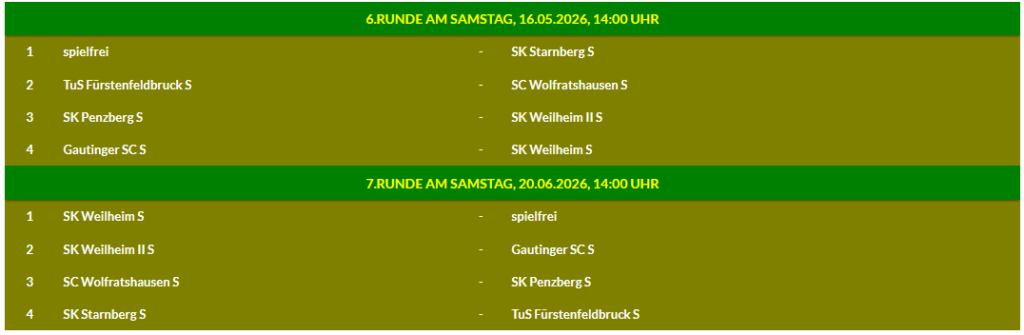 Wir liegen, hinter Tabellenführer Weilheim I, die heute kampflos gegen die offenbar nicht angetretenen Penzberger gewannen, auf dem zweiten Platz. Weilheim I hat aber nur noch eine Partie und eine spielfreie Runde. Wir haben noch zwei Partien, können also aus eigener Kraft noch 6 Punkte holen. Wenn uns das gelingen sollte, wird sicherlich die Begegnung Penzberg – Weilheim II in der vorletzten Runde die Meisterschaft entscheiden. Hoffen wir mal, dass die Penzberger dann eine Mannschaft zusammenbekommen, und nicht auch diese Begegnung kampflos hergeben müssen. Weilheim II liegt nur einen Brettpunkt hinter uns, und hat damit ebenfalls noch deutliche Titelchancen, falls wir im Endspurt „schwächeln“ sollten…