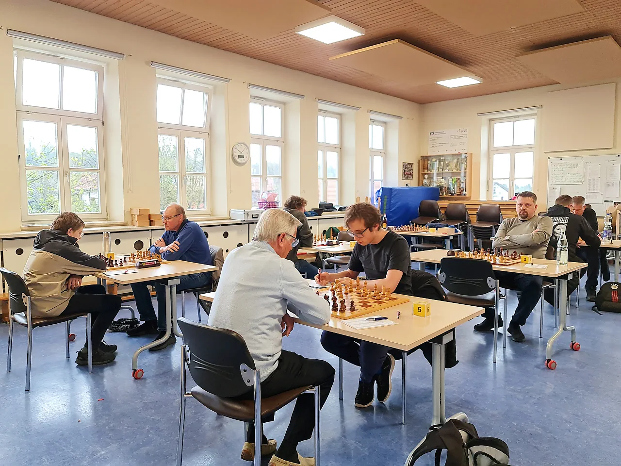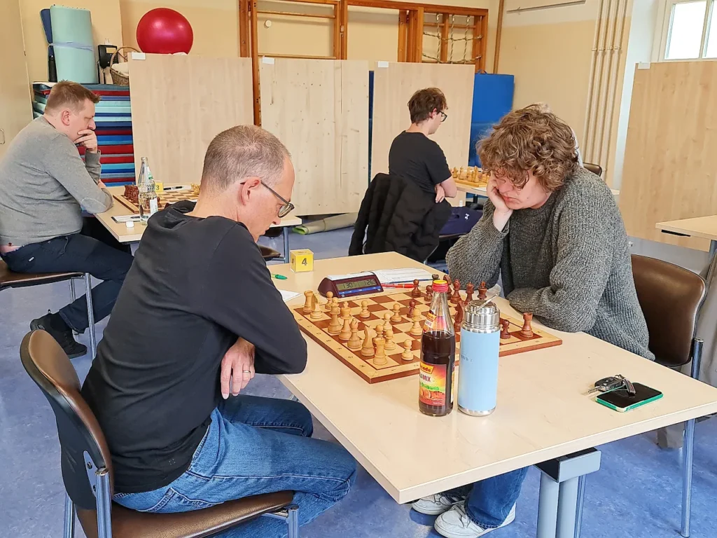 Nun richtete sich alle Hoffnung auf die beiden verbleibenden Partien von Niels Hamann am Spitzenbrett und Knut Schallöhr an Brett 5. Knut hatte ein vorteilhaftes Turmendspiel auf dem Brett, was aber noch lange nicht gewonnen war. Zu unserem Glück leistete sich sein Gegner aber in dieser schwierigen Partiephase eine Unaufmerksamkeit, die Knut mit einem Mattangriff erfolgreich bestrafen konnte. Somit wiederum Ausgleich für uns!