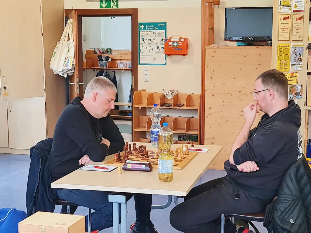 Leider hatten die Gäste, trotz des Saison-Endspurts, in welchem sie auch noch Chancen gehabt hätten, Aufstellungsprobleme: sie konnten keine komplette Mannschaft stellen und mußten das 2. Brett leider frei lassen. Somit ein kampfloser Punkt für Peter Schneider und 1:0 Führung für uns. Schade eigentlich, denn Peter hätte lieber gespielt.